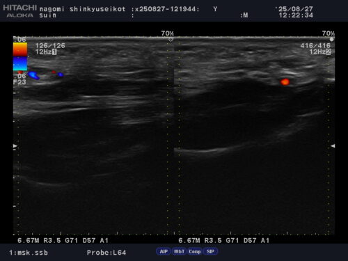 足底筋膜炎の診断にはレントゲンでは映りません。超音波エコーで患部の炎症を確認できます。